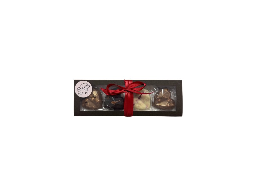 Malá krabička plná radosti a poctivé čokolády. Čtyři ručně vyráběná čokoládová srdíčka v kombinaci hořké, mléčné a bílé čokolády doplněná o pekany, lískové ořechy a lyofilizované ovoce prvotřídní kvality. Každý kousek je originál – ideální jako milý dárek nebo sladká pozornost jen tak, z lásky. Krabička obsahuje: srdce z hořké čokolády s pekany (25g), srdce z bílé čokolády s lyofilizovanými malinami (25g), 2x srdce z mléčné čokolády s lískovými ořechy (2 x 25g). Celkem 4 kusy / 100 g