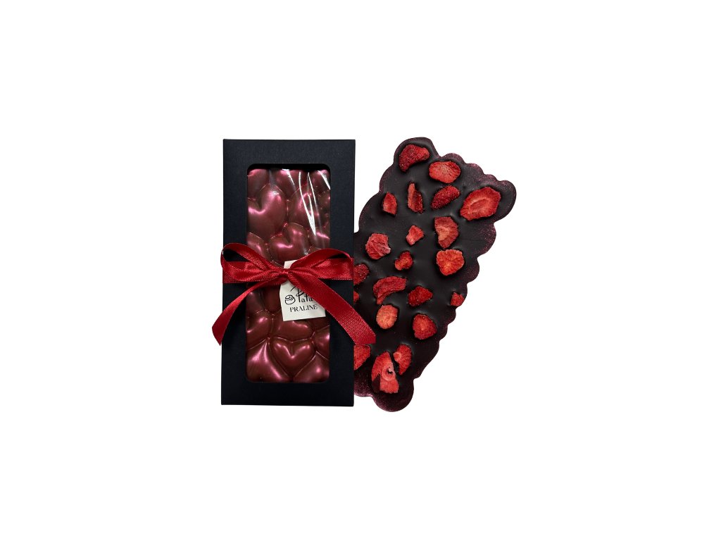 Hořká čokoláda s výraznou kakaovou chutí v kombinaci s ovocnými jahodami vytváří elegantní kontrast chutí. Ruční výroba a reliéf drobných srdcí z ní dělají stylovou čokoládu pro opravdové gurmány.