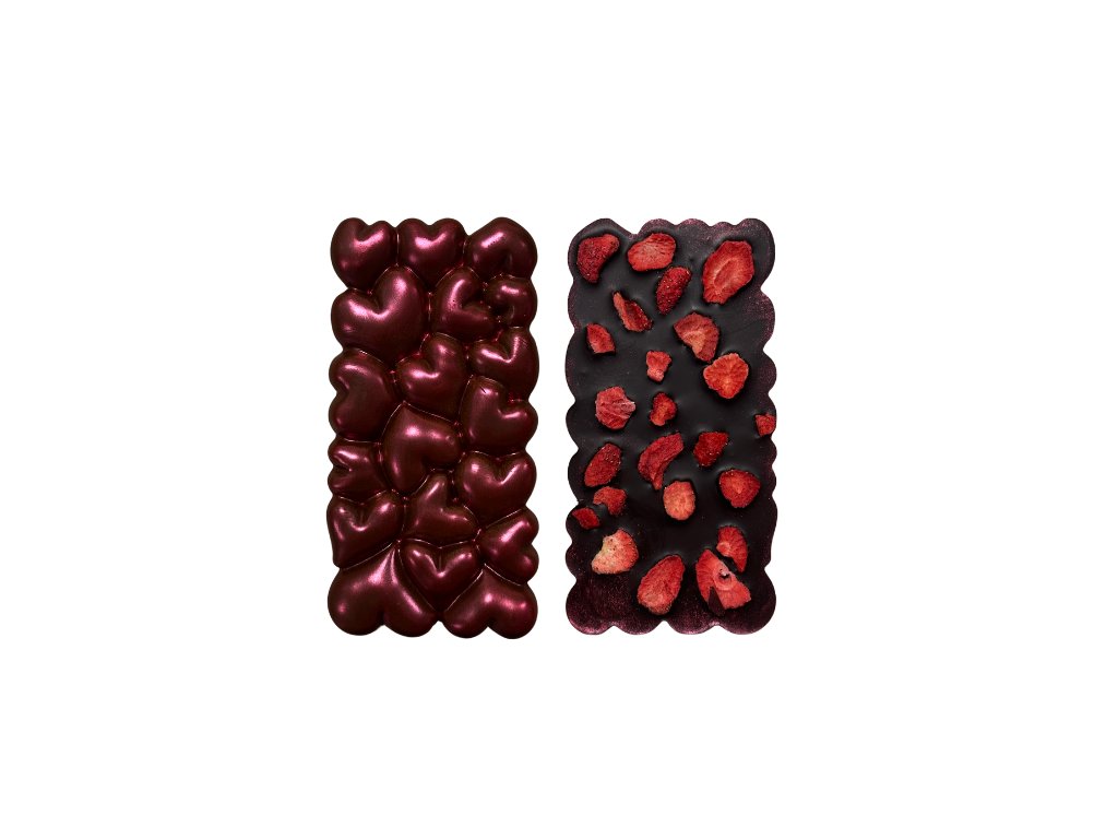 Hořká čokoláda s výraznou kakaovou chutí v kombinaci s ovocnými jahodami vytváří elegantní kontrast chutí. Ruční výroba a reliéf drobných srdcí z ní dělají stylovou čokoládu pro opravdové gurmány.