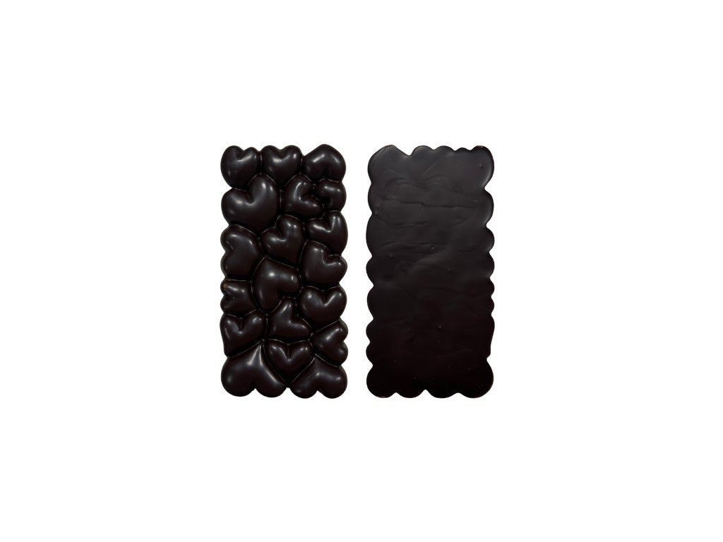 Minimalistická tabulková hořká čokoláda bez posypu, která nechává vyniknout plnou chuť kakaa. Reliéf drobných srdcí dodává čokoládě jemný romantický detail.