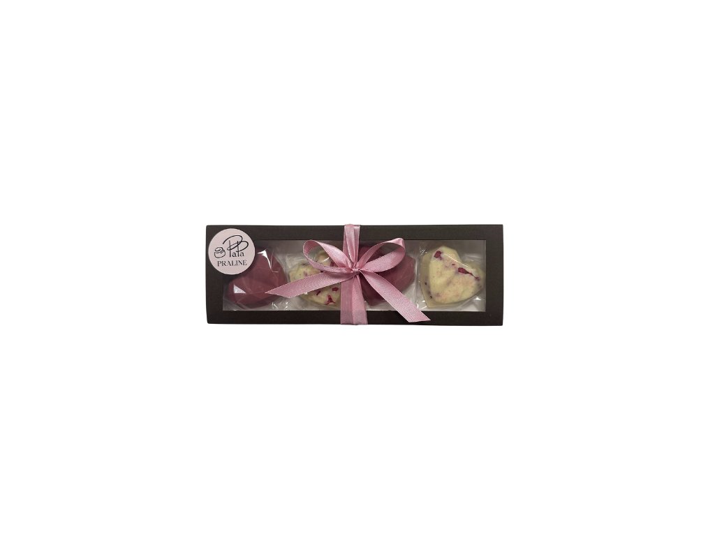Elegantní krabička čokoládových srdíček, která potěší nejen vzhledem, ale i čistou ovocnou chutí. Kombinace bílé čokolády s malinami a růžové ruby čokolády s jahodami vytváří jemně sladký a svěží chuťový zážitek. Použité ovoce je lyofilizované, prvotřídní kvality. Varianta bez ořechů – ideální volba i pro ty, kteří se jim musí vyhýbat. Krabička obsahuje: 2x srdce z bílé čokolády s lyofilizovanými malinami (2x 25g), 2x srdce z ruby čokolády s lyofilizovanými jahodami (2x 25g). Celkem 4 kusy / 100 g.
