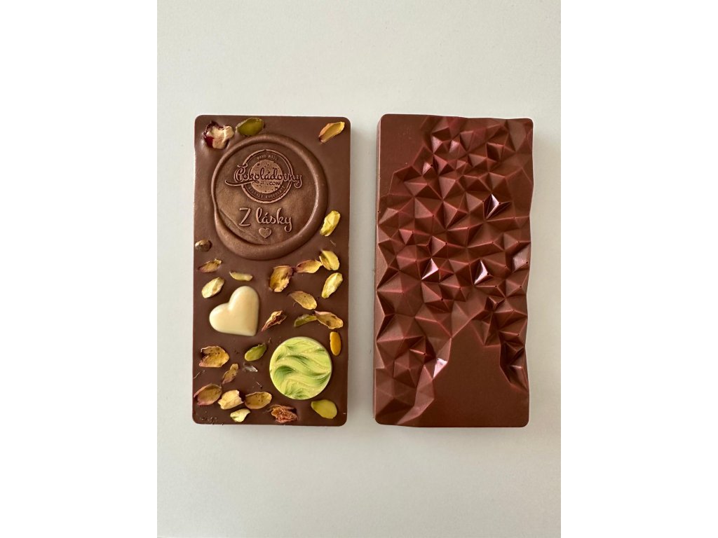 Mléčná čokoláda: minimální obsah kakaových součástí je 34 % (cukr, kakaové máslo, sušené plnotučné mléko, kakaové hmota, sójový lecitin, přírodní výtažek z vanilky), posyp: pistácie, pečeť: hořká čokoláda (minimální obsah kakaových součástí 64 %), mléčná čokoláda (minimální obsah kakaových součástí 34 %), bílá čokoláda (minimální obsah kakaových součástí 28 %), alergeny: mléko, sója