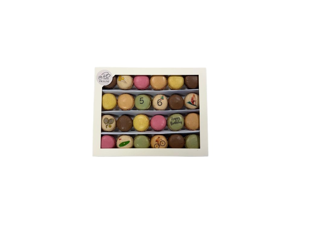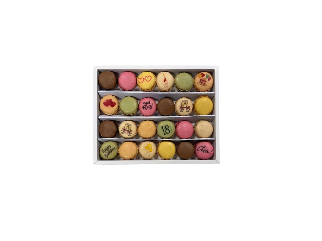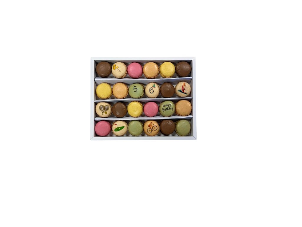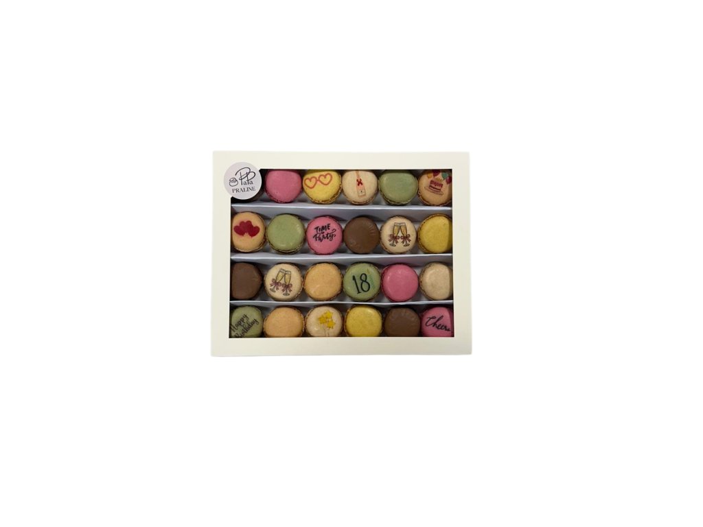 V elegantní krabičce najdete 24 makronek šesti příchutí – krásné, jemné a chuťově vyvážené. Každý box ladíme podle vašeho přání – do poznámky nám můžete napsat věk, jméno či barevné nebo tematické ladění, které se k oslavenci hodí. Rádi vše přizpůsobíme tak, aby váš dárek byl osobní a jedinečný. Potisknout můžeme až 14 kusů makronek🎁 Dopřejte oslavenci sladký zážitek, který se zapíše do paměti stejně jako samotný den.