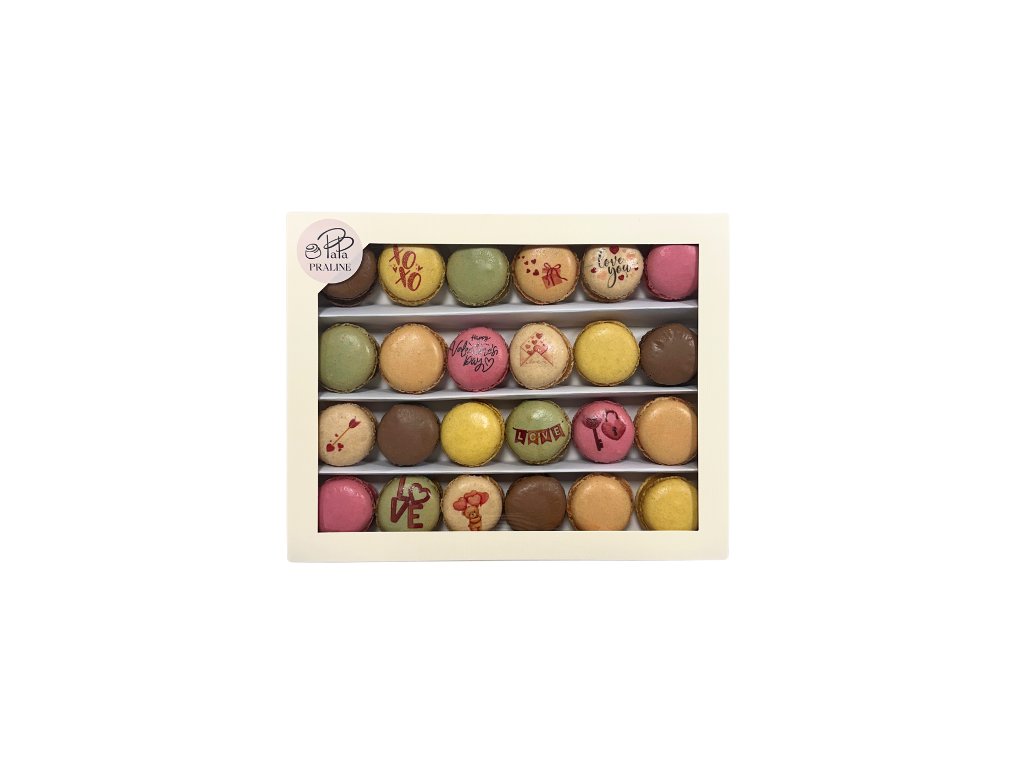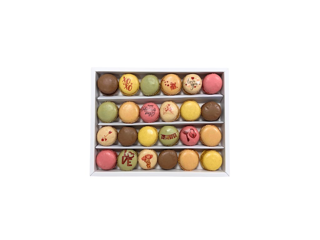 Velká valentýnská krabice plná lásky, barev a chutí. Výběr 24 makronek s valentýnskými motivy jako love, méďa, klíč se zámkem či Happy Valentine’s Day je ideální pro sdílení, oslavu nebo opravdu velké gesto. V tomto balení najdete mix všech našich příchutí: čokoláda, vanilka, slaný karamel, pistácie, malina, citrón. Perfektní dárek pro ty, kteří si Valentýna chtějí vychutnat opravdu naplno. 💡 Pro zachování maximální čerstvosti doporučujeme makronky uchovávat v chladu, nejlépe v lednici.