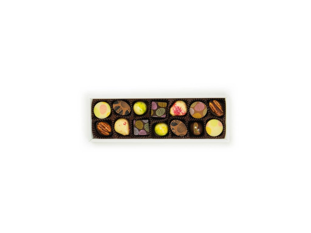 Připravili jsme si pro Vás velikonoční limitovanou edici 14 kusů ručně vyráběných pralinek s veselými jarními motivy. Kombinace chutí jsme pečlivě ladili tak, aby si každý našel své. Od smetanových krémových po jemné ovocné tóny. Bonboniéru můžete smlsnout sami nebo se s ní podělit se svými blízkými a zpříjemnit si tak velikonoční svátky kvalitními pralinkami.